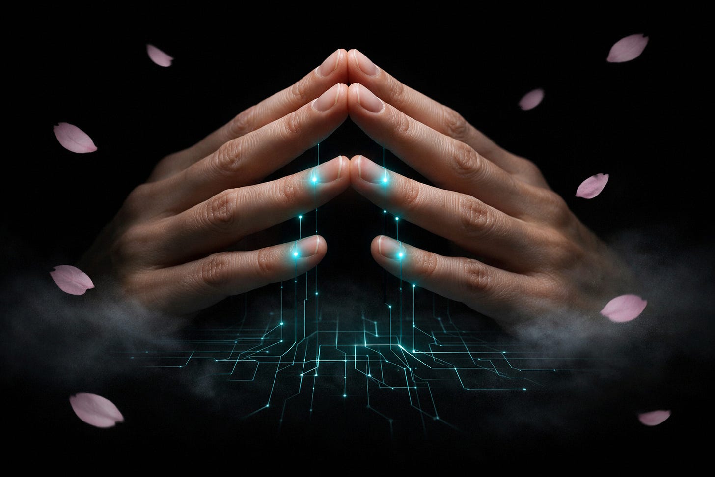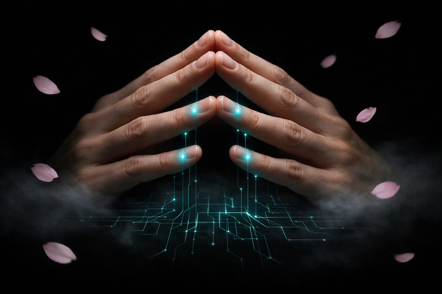 You close your eyes. You steeple your fingertips together and press lightly — tip to tip. You move your attention slowly around the points of contact. The heat. The pressure. The texture. You stay there for two minutes without trying to solve anything.